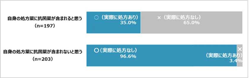 自身の処方薬に抗菌薬が「含まれている」と思う人と、「含まれていない」と思う人で、実際の処方の有無を確認しました。「含まれていない」と思う人は、96.6%が実際に抗菌薬処方がなく、自身の処方を正しく認識していたのに対し、「含まれている」と思う人の中で実際に抗菌薬を処方されているのは35.0%であり、65.0%の人が実際に処方されていないのにも関わらず処方されたと思い込んでいることが判明しました。
