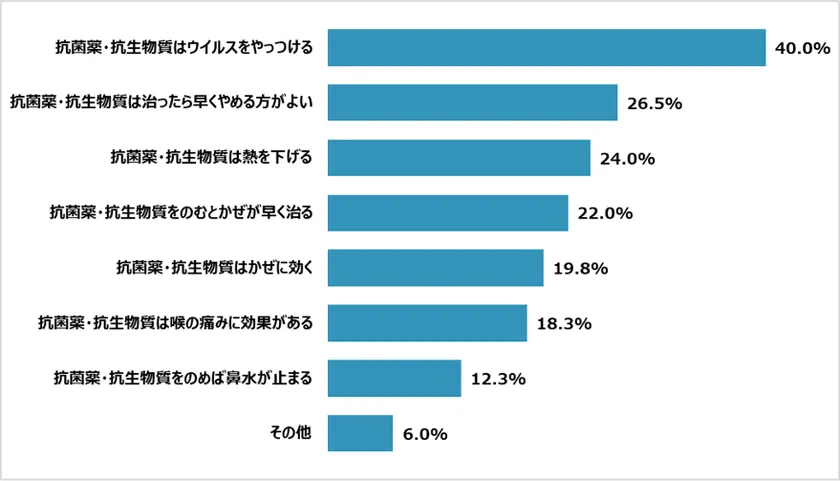 抗菌薬の誤解に関する質問です。抗菌薬に関して誤っている内容に関して、誤解している割合を調べたところ、最も誤解が多かったのは「抗菌薬はウイルスをやっつける」(40.0%)、ついで「抗菌薬はかぜ症状が治ったら早くのむのをやめる方がよい」(26.5%)、「抗菌薬は熱を下げる」(24.0%)の順となりました。