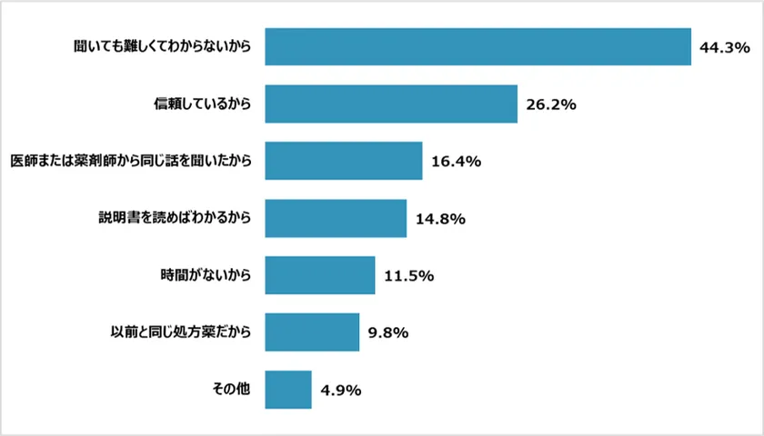 医師や薬剤師の話をあまり聞いていないと回答した方にその理由を質問したところ、「聞いても難しくてわからないから」が44.3%で最も多く、次いで「信頼しているから」が26.2%でした。
