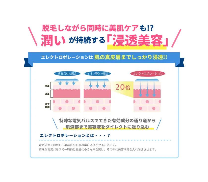 ストラッシュのエレクトロポレーション脱毛は、脱毛効果だけでなく美容成分を角層への浸透させることでニキビ跡や皮膚の色素沈着・肌荒れ改善など美肌への効果が期待できます。