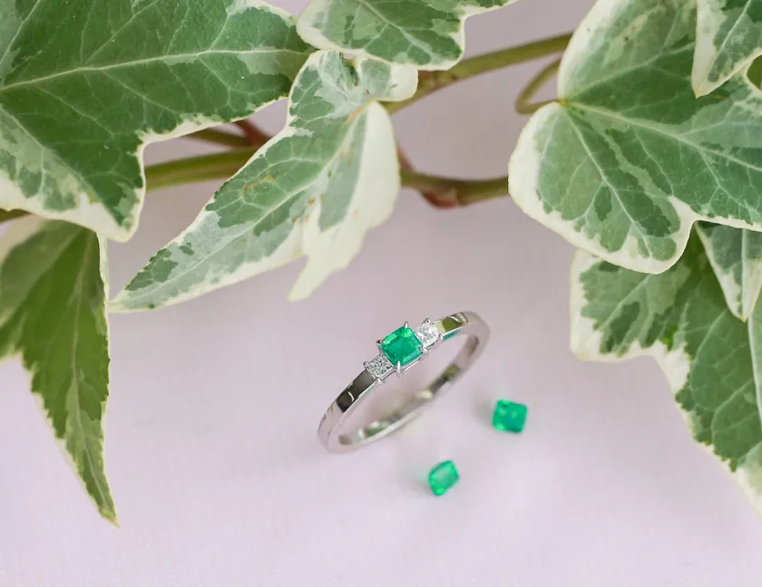 シャープなシルエットとサイドのプリンセスカットダイヤモンドが、エメラルドをより高貴な印象に。