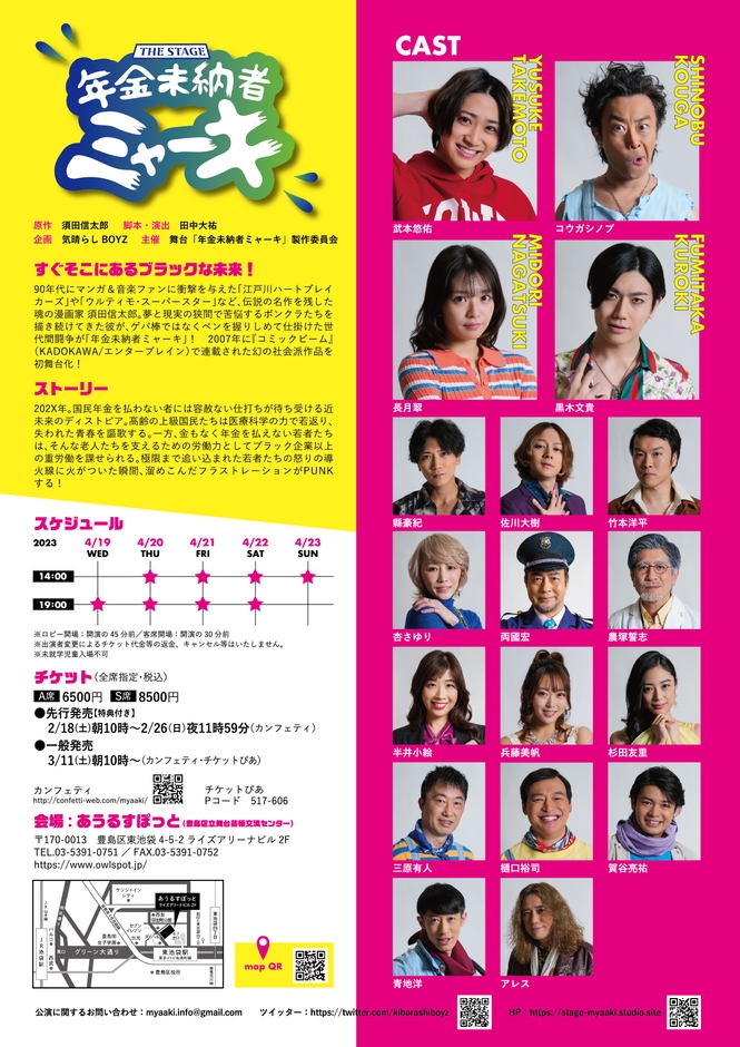 舞台「年金未納者ミャーキ」製作委員会主催、舞台「年金未納者ミャーキ」(原作:須田信太郎、脚本・演出:田中大祐)が2023年4月19日(水)~4月23日(日)にあうるすぽっと(豊島区立舞台芸術交流センター)(東京都豊島区東池袋4-5-2 ライズアリーナビル2F)にて上演されます。