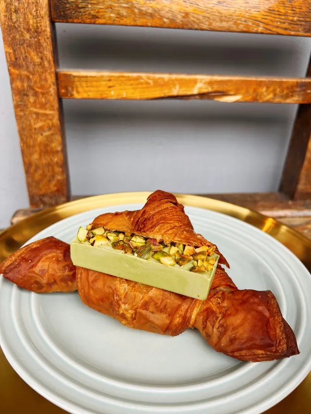 シェフ厳選のイタリア産ピスタチオをたっぷりと使用した、ホワイトチョコレートクリームを塩クロワッサンでサンド。丁寧にローストしたピスタチオ香る、上品な一品。