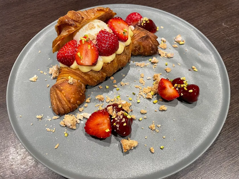 バリバリ食感と豊潤なバターの風味が特徴の塩クロワッサンに、カスタードクリームと濃厚バニラアイスの上品な甘さ、イチゴの程よい酸味のバランスと素材にこだわった一品。クラッシュしたスペインの伝統的な焼き菓子「ポルボロン」がアクセント。