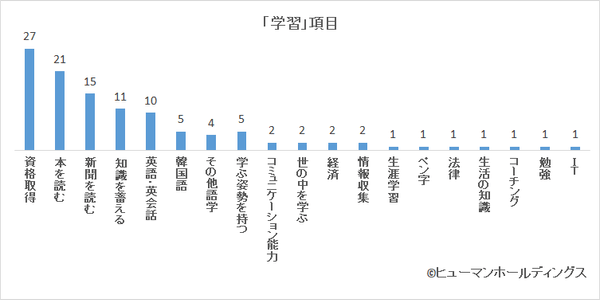 「人生目標」を達成するために必要な8大分野の各項目の中で一様の傾向があったのは「学習」の項目で、27名が目標(複数設定可)のひとつに「資格取得」を挙げています。TOEIC(R)、ITパスポート、キャリアコンサルタント、社会保険労務士等の資格取得を目指す人が見られ、「資格手当が出る分早めに」「取得することで給料にも反映されるから」「仕事に役に立つ資格をとる」等、現在の仕事に役立てたいと考える人や、「労働法と社会保険のプロになるために」「キャリアアップにつながる資格を取得する」等、今後のキャリア構築に繋げる目的の人が多い一方で、「資格をとって自分に自信をつける」と、資格取得によって自身のスキルを可視化することで精神面でも効果があると考えている人もいるようです。