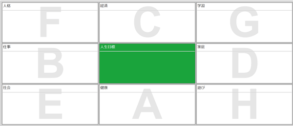 SELFingシートには「人生目標」(人生を通した目標設定)と「3年後の自分」(短期の目標設定)の2種類があり、「人生目標」シートは、真ん中に「人生目標」、周囲8マスには人生を構成する8大分野「健康」「仕事」「経済」「家庭」「社会」「人格」「学習」「遊び」が設定されています。「3年後の自分」シートは、主に人生目標シートの「仕事」で設定した目標から発展させて作成します。