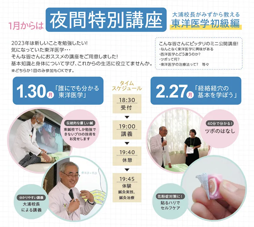 東洋鍼灸専門学校(所在地:東京都新宿区)は、大浦校長に学ぶ「東洋医学初級編」の第2回講座を2023年2月27日(月)に東洋鍼灸専門学校 第一校舎で開催いたします。