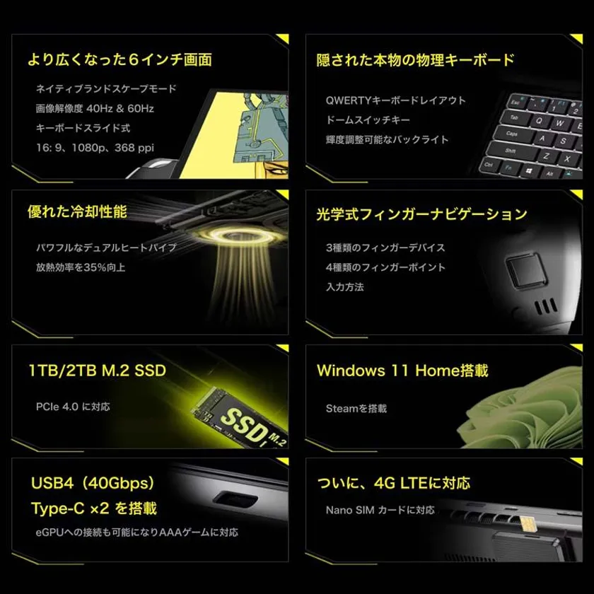 GPD WIN4はAMD 6800Uを搭載した世界最小のポータブルゲーム機スライド式キーボード Windows 11を搭載SteamOSもサポート、薄型・軽量で持ち運びや長時間のゲームプレイに最適化したポータブルゲーミングPCです。