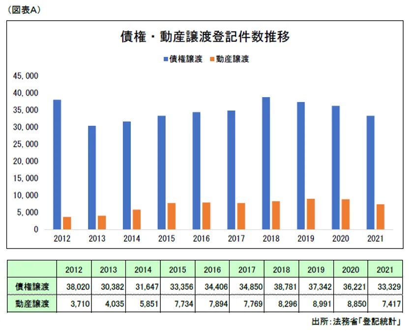 2012年から2021年まで直近10年間の債権・動産譲渡登記件数の推移において、債権譲渡登記件数は、3万件台で安定的に推移しており、今後も継続的な利用が見込まれ、動産譲渡登記は、直近では7~8千件台で推移し、2012年から利用が倍増しています。(図表A)
