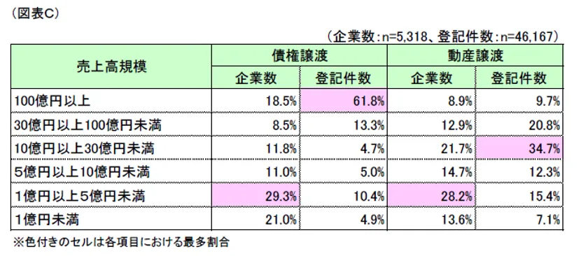 登記件数としては、債権譲渡をファイナンスサイクルに組込み、繰り返し利用する大規模企業が多いことで売上高「100億円以上」が最多となっているものの、企業数としては売上高5億円未満の企業数が5割超となっており、大規模企業を除くと債務の弁済や資金調達を要する小規模企業が譲渡人となるケースが多いといえます。(図表C)
