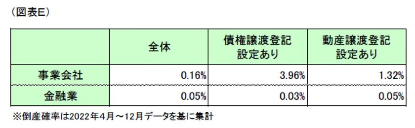 事業会社に債権譲渡登記が設定されている場合の倒産確率(3.96%)は、事業会社全体における倒産確率(0.16%)の約25倍と非常に高くなっており、動産譲渡登記が設定されている場合の倒産確率(1.32%)においても、事業会社全体の約8倍と高い水準となっています。一方、金融業においては倒産がほとんど発生しておらず、譲渡登記の設定有無が倒産確率に影響していないことがうかがえるため、譲渡登記設定情報は、事業会社に対する与信管理上で重要な情報となることが分かります。(図表E)
