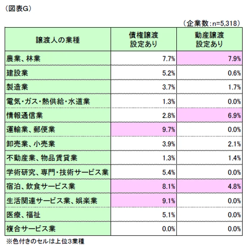 動産譲渡人の倒産確率においては、「農業・林業」(同7.9%)、「情報通信業」(同6.9%)、「宿泊、飲食サービス業」(同4.8%)の順となりました。動産譲渡においては倒産が発生していない業種が多い中、上位3業種は突出して倒産確率が高いため、注意が必要といえます。(図表G)