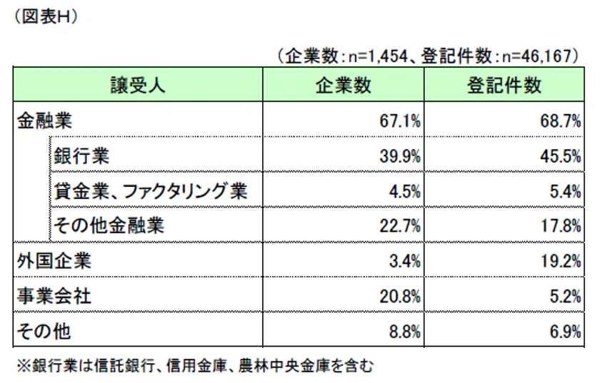 事業会社が譲渡人として設定された46,167件に対し、相手方となる譲受人を集計したところ、企業数としては「銀行業」(企業数割合39.9%)が最も多く、「貸金業、ファクタリング業」(同4.5%)と「その他金融業」(同22.7%)を合わせた金融業全体で67.1%を占めました。登記件数においても、銀行業が45.5%となり、金融業が全体の約7割を占める結果となっています。(図表H)