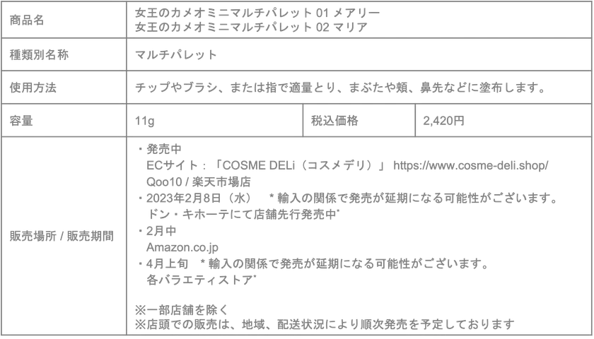 グローバルトレンドコスメを扱う「COSMEDELi(コスメデリ)」を運営するライフスタイルカンパニー株式会社(本社:東京都中央区、代表取締役:菊池 尚)は、中国コスメ『COLORROSE(カラーローズ)』の「女王のカメオシリーズ」より、ミニマルチパレット2種、リップスティック4種を2023年2月8日(水)からドン・キホーテにて先行発売*しております。その後Amazon.co.jpでも展開し、4月上旬より各バラエティストアで拡大販売*いたします。
