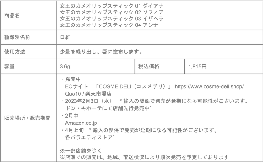 自社ECサイト「COSMEDELi(コスメデリ)」とQoo10、楽天市場店で発売中 店舗では、2023年2月8日(水)ドン・キホーテにて先行発売中* その後Amazon.co.jpで展開 4月上旬より各バラエティストアで拡大販売