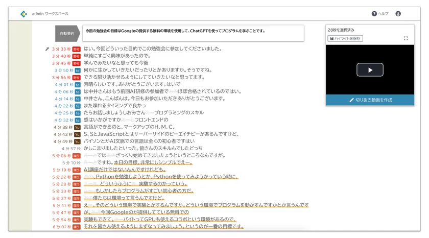 文字起こしされた動画はテキストだけでなく喋った時間と誰が喋ったのかがわかります。また、再生すると正に話されている場所がリアルタイムにハイライトされるので、動画の振り返りが大変便利です。