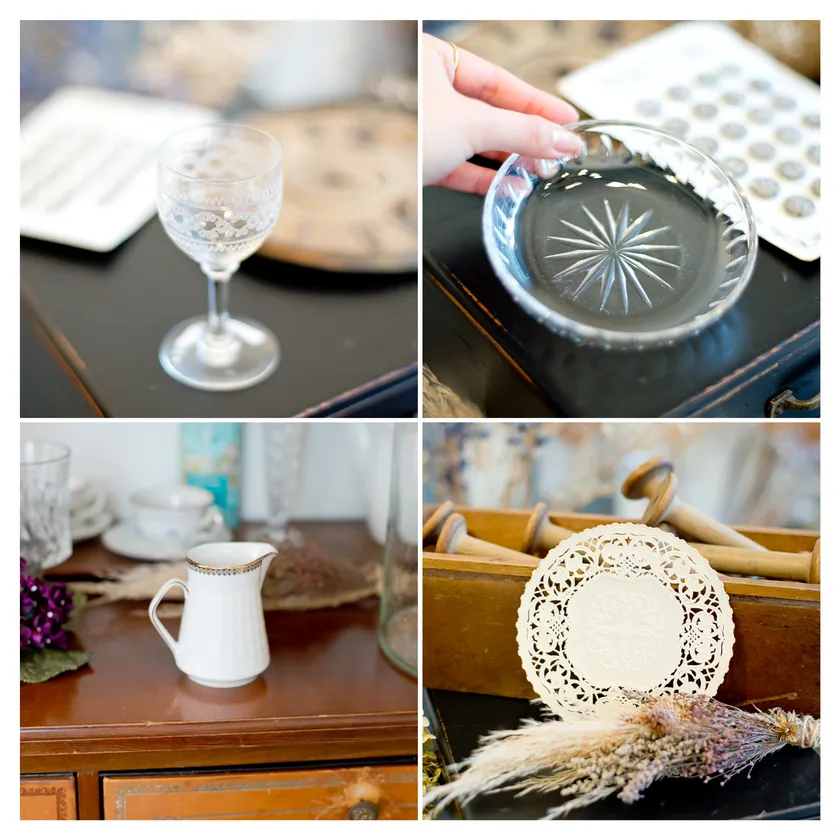 フランスのヴィンテージガラスや、すずらんのアンティークペーパー、ミルク入れやカップアンドソーサーなどなど。