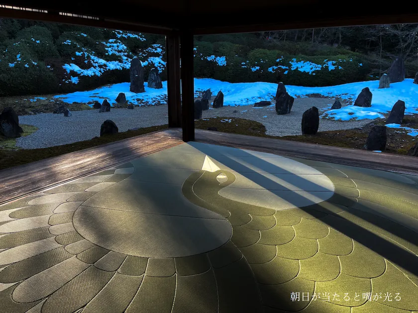 畳の色は全て同じ色ですが、光の反射で色を変化させているので、立っている位置を移動すると畳の色が反転する仕組みになっています。天然の国産イグサを利用しており、時間帯によっては光の反射によって畳が金箔を貼ったように美しく見えます。