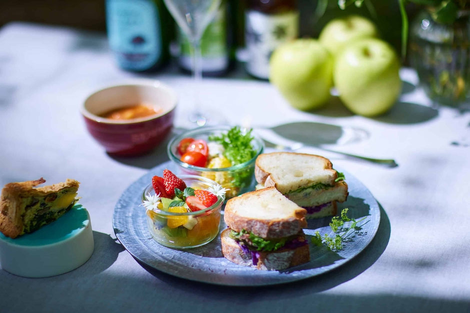 新緑の絶景の中で味わうのは、その景色をイメージし、野菜をたっぷりと用いた当プログラム特製のランチです。ランチには、アスパラガスやルッコラ、香草などを取り入れた「新緑サンド」3種と、サラダやスープなど、彩り鮮やかな料理が詰め込まれています。また、料理に合わせて、ソムリエがセレクトしたのは野菜やハーブにもっとも合うソーヴィニヨン・ブランです。フランスのロワール、ボルドー地方をはじめとする代表的な産地より、選りすぐりのソーヴィニヨン・ブランを3種類用意しました。爽やかな飲み心地とフルーティーな味わいで、軽やかな料理にぴったりです。ハーブの香りが漂ワインを片手に、渓流の新緑とランチを満喫できます。