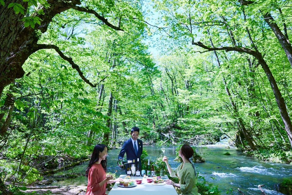 奥入瀬(おいらせ)渓流沿いに建つ唯一のリゾートホテル「星野リゾート 奥入瀬渓流ホテル」では、2023年5月8日~31日までの月曜日、火曜日限定で、新緑が美しい渓流沿いでランチを楽しむプログラム「渓流新緑ランチ」を今年も実施します。その時期に新緑が一番綺麗な場所へ出かけ、絶景の中で新緑をなぞらえた彩り鮮やかなランチと、ソムリエが厳選した料理にぴったりのワインを味わえます。さらに2023年は、透き通るような新緑をイメージして、青リンゴを使った清涼感が特徴のシードルも料理と一緒に楽しめます。雪解け水が流れ込む奥入瀬渓流で冷やしたこだわりのシードルを新緑の絶景を眺めながら味わえるプログラムです。