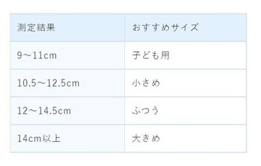 (4) お顔のサイズが測れたら、次の表を参考にマスクのサイズをお選びください。