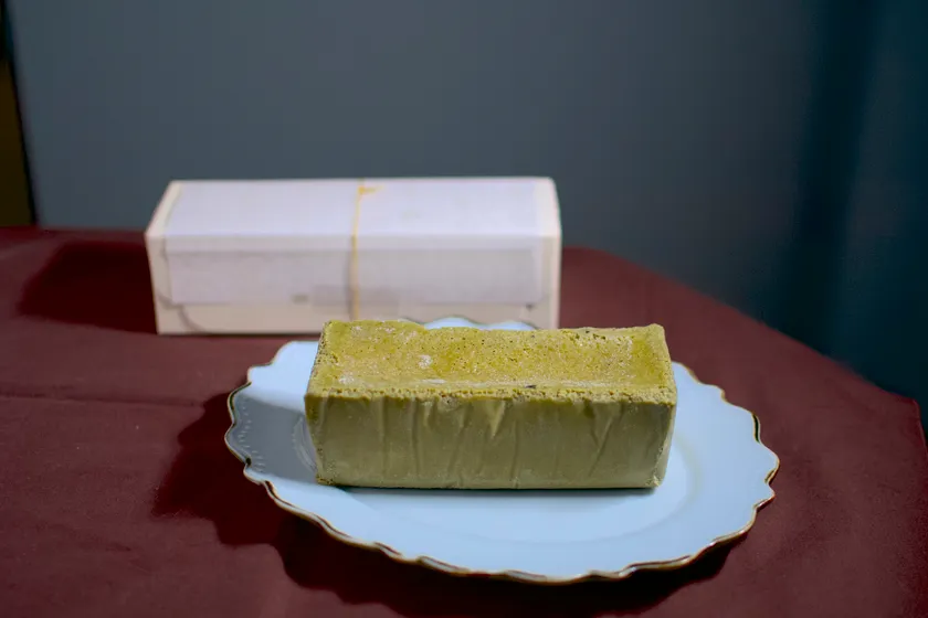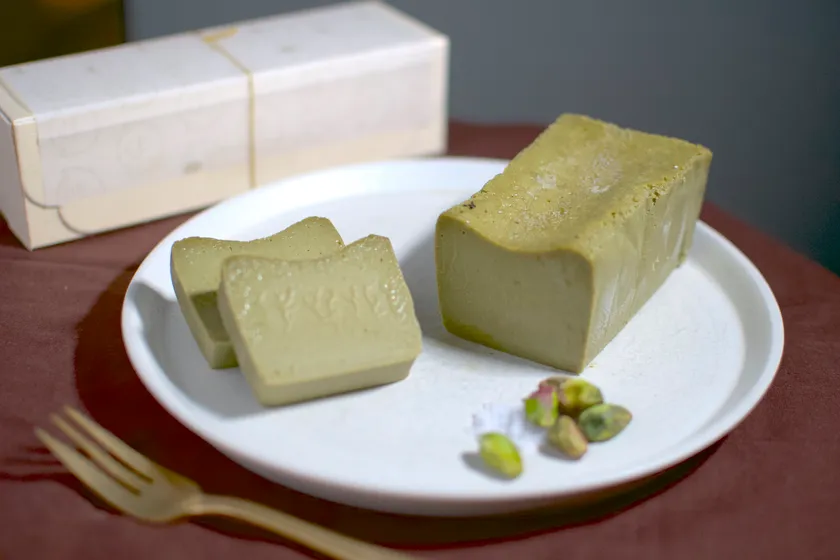 小麦粉を一切使用せず、スペイン産のクーベルチュールホワイトチョコレートに、最高級のイタリア ブロンテ産のピスタチオを閉じ込め、焼き上げています。濃厚なホワイトチョコレートの味わいの中にピスタチオの奥深さと香ばしさを存分に楽しめる、贅沢なスイーツです。これまでカットの販売は行っておりましたが、今回初めての1本販売となります。