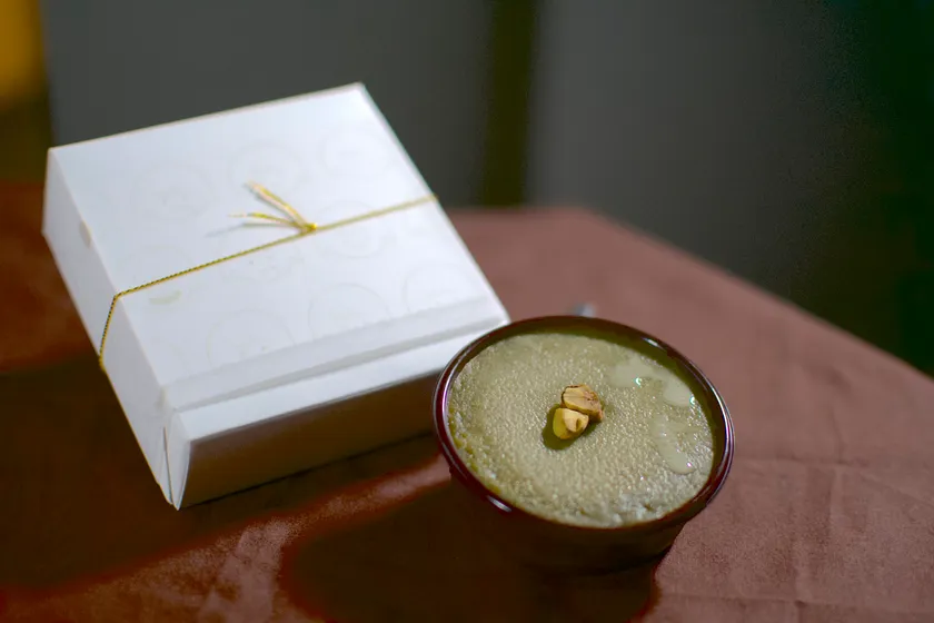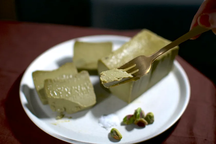 また、3温度帯で3つの食べ方を楽しむことができ、冷凍ではアイスのようなしっかりとした食感に。半解凍では舌で溶かしながら食べることでホワイトチョコレートのコクの後にピスタチオの香ばしさを。冷蔵では一口目からピスタチオの濃厚さとなめらかでねっとりとした食感を楽しむことができます。