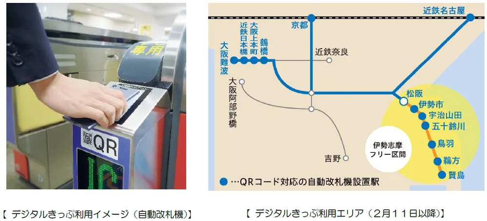 近鉄では、2023年2月11日(土・祝)から、新たに大阪難波駅、近鉄日本橋駅、大阪上本町駅、鶴橋駅、京都駅の5駅を対象に、QRコードを活用したデジタルきっぷサービスを開始いたします。
