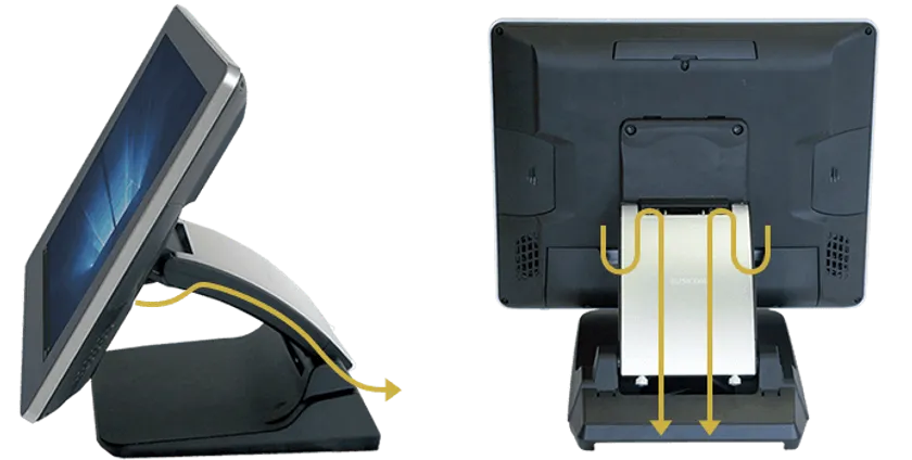 「Seav-15f II」は、Windows 10 IoT Enterprise LTSCを搭載した業務向けタッチパネルPCです。LTSCはPOSレジなど特定の用途で使用される端末向けのOSで、Windowsのメジャーアップデートの影響がないため業務アプリを安定した環境でご利用いただけます。また、Seav-15f IIでは、接続機器に電源供給ができるPowered USBや、複数のUSBポートなど拡張性の高いインターフェースにより用途に合わせた周辺機器を接続できます。上下の首振りと高さ調整の可動域を持つ2軸スタンドを装備しているので、受付カウンターなどでもモニターを主張しすぎずに設置ができます。