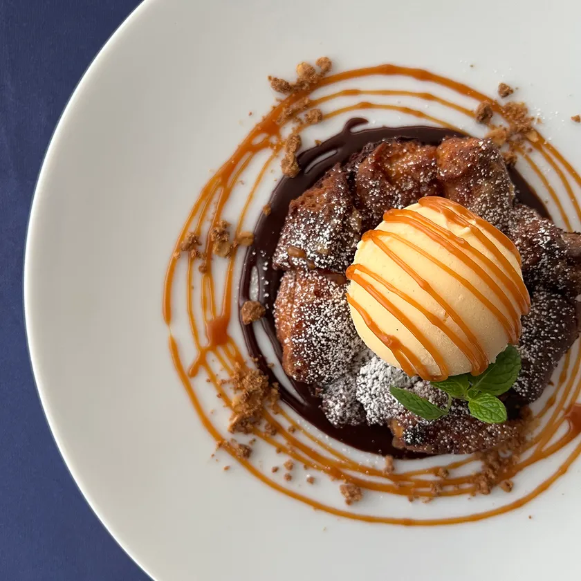 ドーナッツで作ったブレッドプディングにバニラアイス、バーボン入りのファッジソースとキャラメルソースをかけた、究極のアメリカンスイーツ。