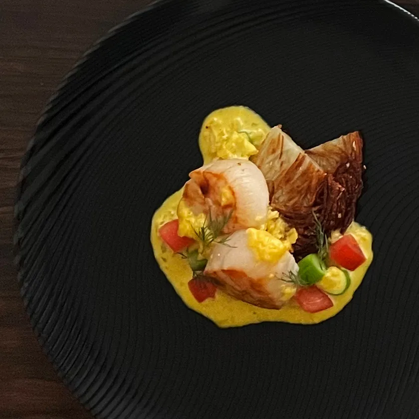 サフランとアサリの出汁を使ったクリームソースがホタテ貝の甘みを引き立てます。
