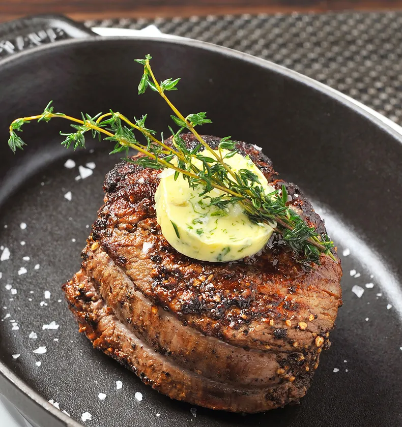メインのステーキは、925度で焼き上げるUSDA最高位プライムグレードのフィレミニヨン。柔らかさときめ細やかな肉質の赤身肉が魅力のニューヨークで一番人気のステーキ。