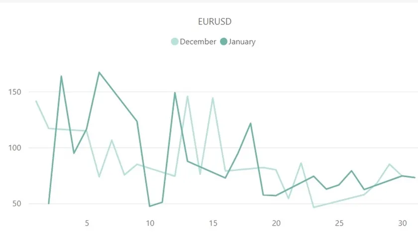 上記は、2022年12月と2023年1月のユーロドル(EUR/USD)のボラティリティ推移を比較したものです。1月のユーロドルの最大ボラティリティを記録したのは3日の163.6pipsで、12月の145.6pipsと比べ約20pips近く増加しました。一方、12月の1日当たりの平均ボラティリティ88.9pipsに対して、1月の平均ボラティリティは88.4pipsでした。また、ボラティリティの推移では、引けより寄り付きに掛けて、1月のユーロドルのボラティリティは高まっていたことが確認できます。18日の日銀会見・金利決定のファンダメンタルズが発表された日は、ユーロドルのボラティリティも上昇にも影響を与えました。