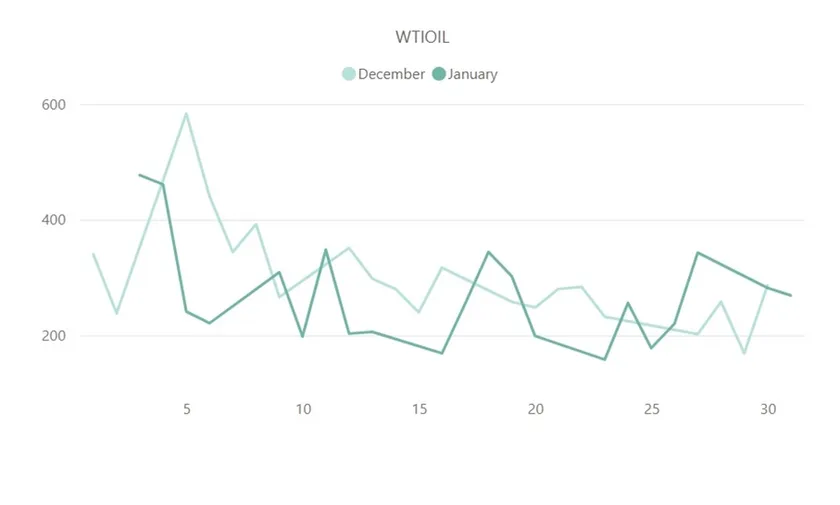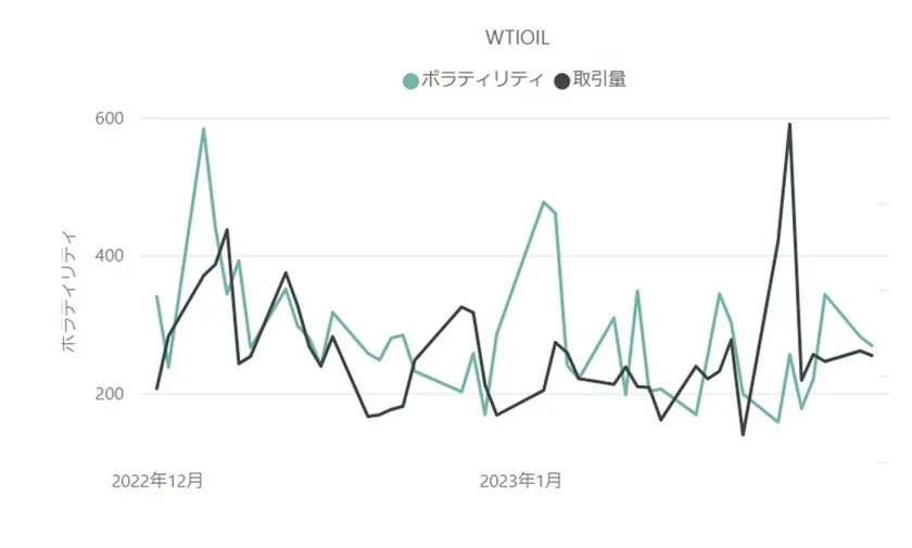 上記は、2022年12月・2023年1月を対象とした、WTI原油(WTIOIL)の取引量とボラティリティの推移を示したグラフです。先月同様に、取引量とボラティリティの推移はおおむね相関して動いているものの、最大ボラティリティと最大取引量を付けたタイミングは大きくズレていることが確認できました。考えられる要因として、WTI原油の月間最大ボラティリティを記録した日付は、2023年最初の相場であったことが挙げられます。年初は相場の流動性が低くなる傾向があるため、それによってボラティリティが高まったと考えられるでしょう。現に、寄り付きで大きく下げた値幅は、中旬頃には完全に打ち消すほど相場は上昇しています。