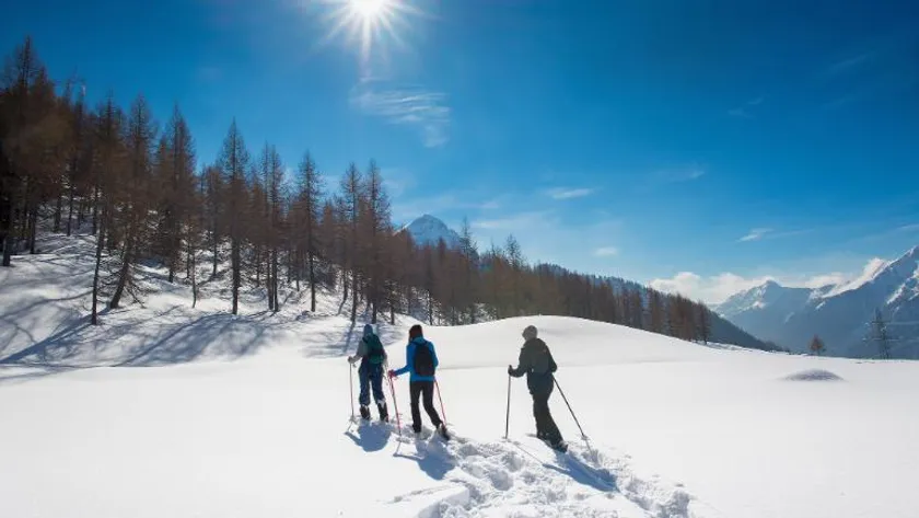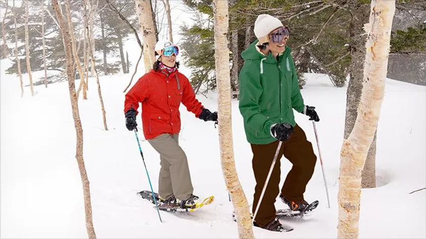 『西洋かんじき』という雪の上を歩くための歩行用具で大毛無山の大自然を満喫いただけます。雪上を歩く際に装着する事で足が埋もれない為、誰でも雪山や雪原を歩く事ができ、スキーやスノーボードが苦手な方でも気軽に冬の大自然がお楽しみいただけます。年齢・性別問わず楽しむことができて、お子様の雪山デビューにもオススメです。