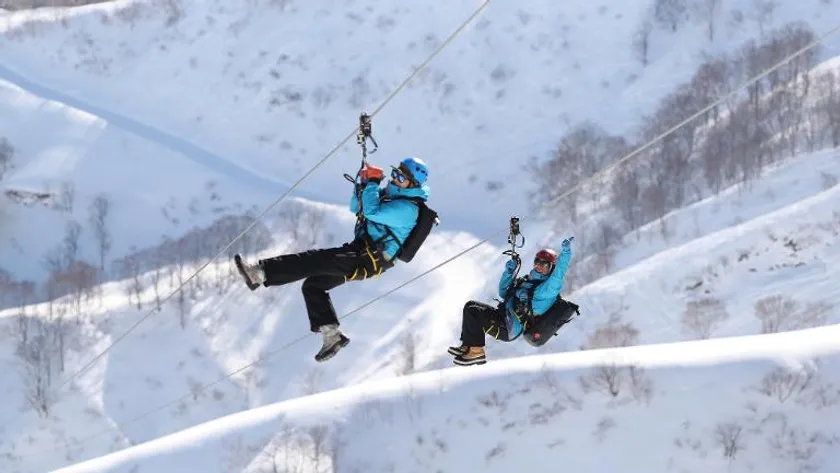 ロッテアライリゾートのジップツアーは全長1,501m、標高950mのスタート地点から一気に下り降ります。その高低差はなんと240m!スノーシーズンは見渡す限りの銀世界を、グリーンシーズンは広大な緑の絨毯を眺めながら、ここでしか体験できない感動を、ぜひ味わってください。