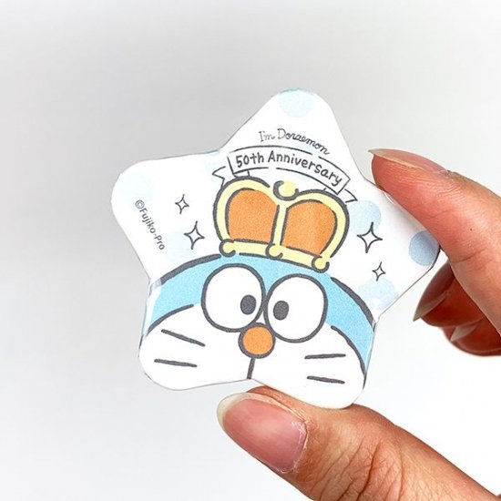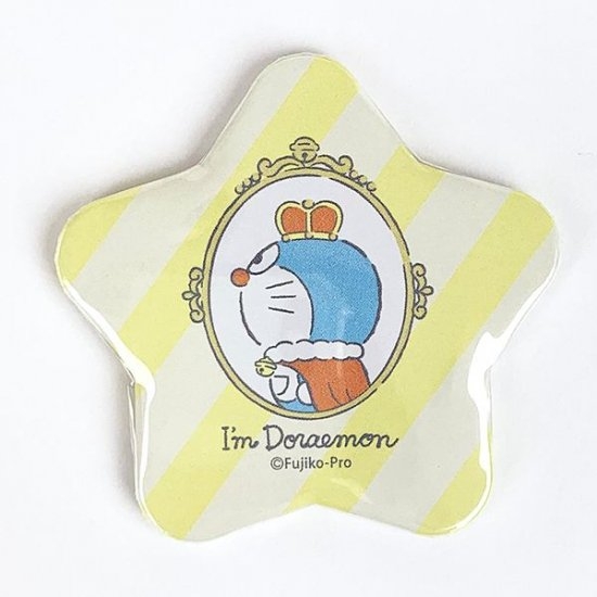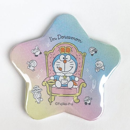まずは星形のツヤっとした缶バッチ!入りきらないドラえもんの顔が可愛すぎる!王冠の赤が目を引いてワンポイントにバッチリ☆