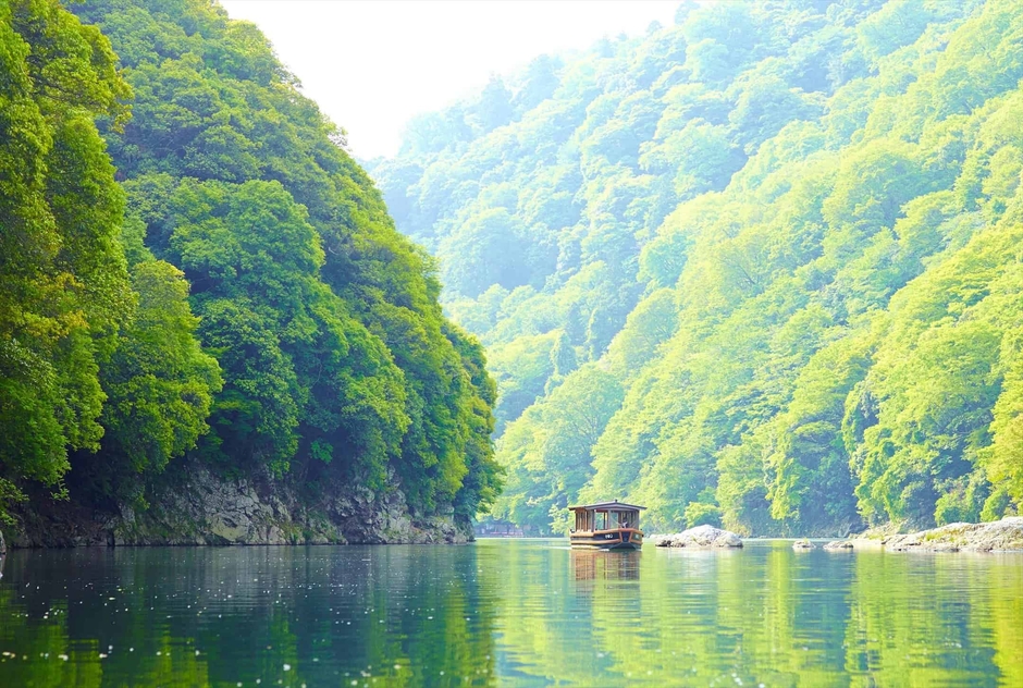 【昼】嵐峡の新緑を眺めながら屋形舟「翡翠」での舟遊びを楽しむ