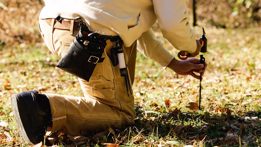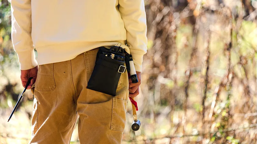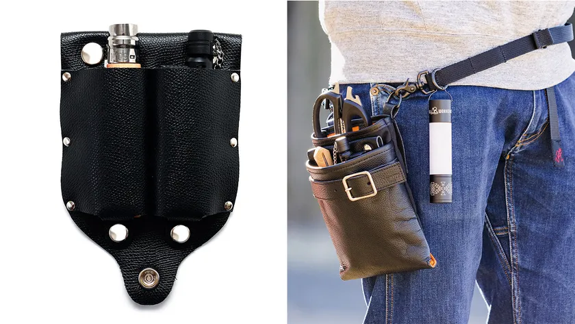 参考にしたのが、職人さんが腰から工具を下げる時に用いる「腰袋」。必要なツールは袋の中にまとめて、常に両手が自由になるスタイルを目指しました。