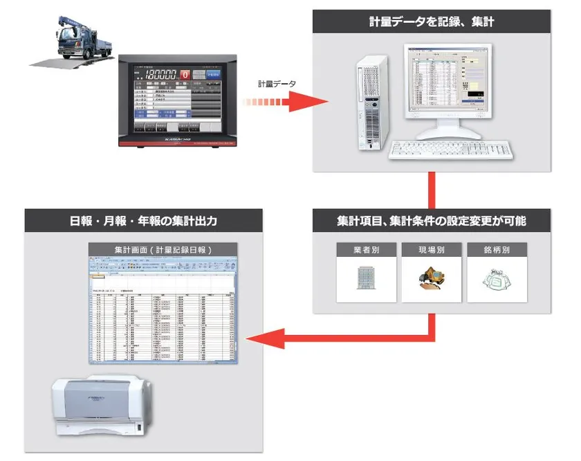 鎌長製衡のトラックスケール用「データ処理システム」は計量伝票の発行や、計量データの集計はもとより、契約・受付・配車・マニフェスト・売上・請求・精算など幅広い業務に対応可能です。