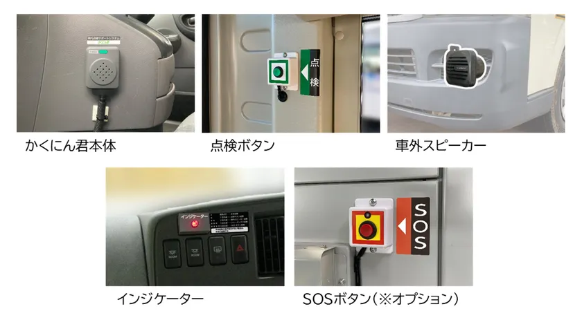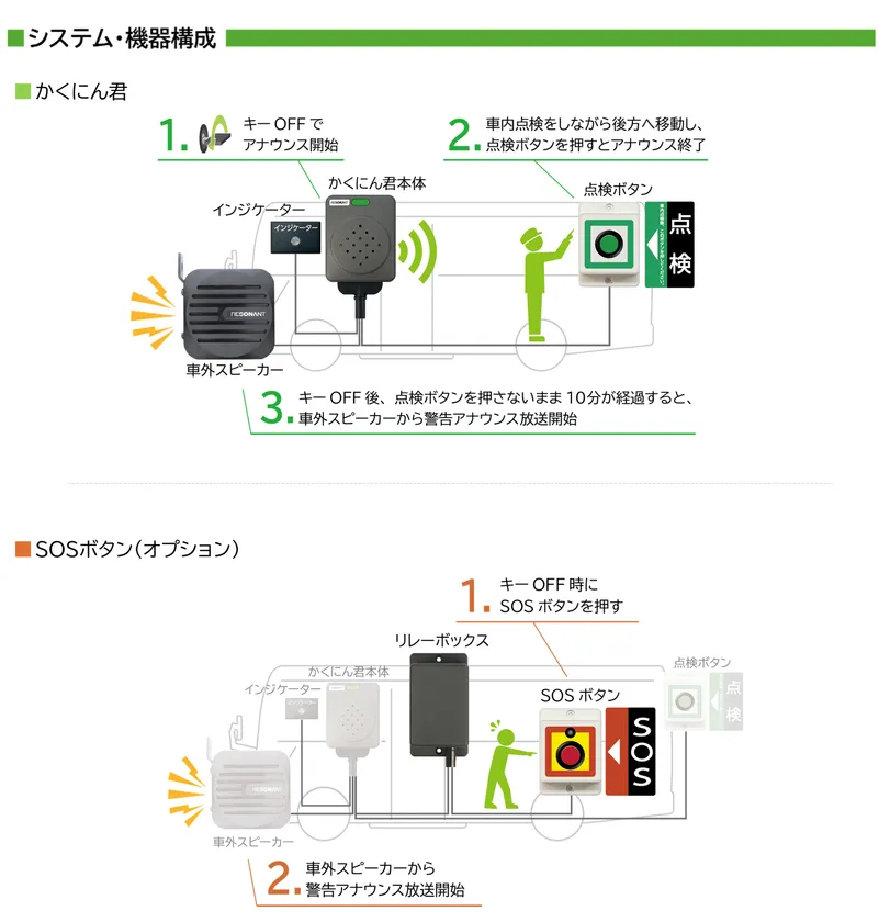『かくにん君』は車両キーOFFに連動し、車内点検を促すアナウンスが流れ、「点検ボタン」が押されるまで繰り返し流れ続けます。点検ボタンを車両後部に設置することで、点検者が必然的に後部座席まで確実に点検を行えるようになり、置き去り事故を防止します。また、有線式のため電池切れ等の心配がなく、確実な動作を実現しました。