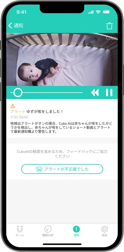 赤ちゃんは成長に伴い、母乳やミルクを飲む量が増えていきます。しかし消化器官はまだ未発達なため、ミルクが逆流しやすくなり、吐き戻しが多くなる原因となっています。吐き戻しを心配しているママパパへ!CuboAiの咳検出アラート機能なら、赤ちゃんの咳や吐き戻しを感知するとすぐにスマホに通知し、その様子を動画で記録します。赤ちゃんの健康状態を更に確実に把握することができ、ママパパの不安も軽減できます。赤ちゃんが5ヶ月目以降になり、吐き戻しの頻度が少なくなってきても、風邪を引きやすい季節の変わり目などに咳検出機能から、赤ちゃんの体調を把握することができます。