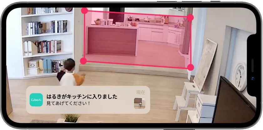 赤ちゃんが大きくなると、ママが支えなくても、しばらくの間なら一人で椅子に座れるようになりますが、動くと同時に床に転落する恐れが多くなります。予期せぬ転落が心配なママパパへ、CuboAi の危険エリアアラートと過去18時間の自動録画再生機能を使ってみませんか?ベビーゲートが設置しにくい形のキッチンなどを危険エリア範囲として設定すると、お子さまが危険エリアに近づく(または入る)と10秒以内にスマホに通知します。CuboAiアプリの通知ウォールで7日以内に発生した出来事を全て見ることができますので再発の防止にも繋がります。さらに、過去18時間録画機能を合わせて使用することで、赤ちゃんが転落した理由が把握でき、事故の対策をすることができます。