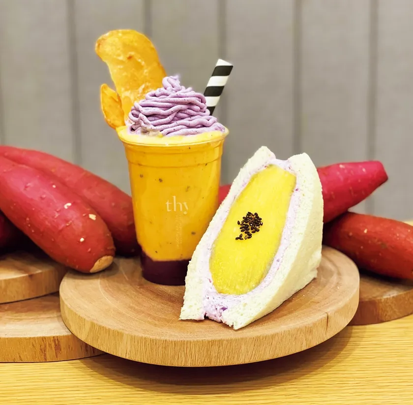 目利き八百屋が厳選したさつまいもを使ったこだわりのスムージーとサンド。スムージーは紅はるかベースと紫芋の2層仕立て。