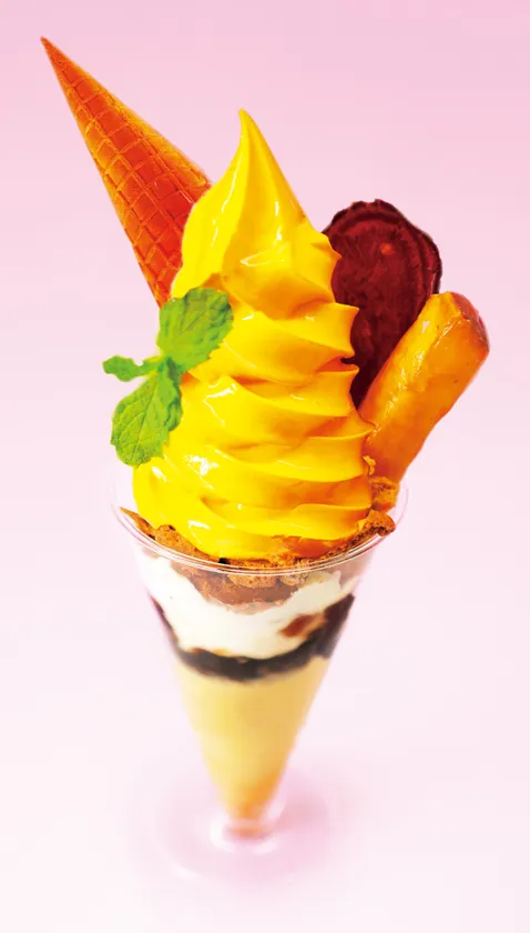 完熟「紅はるか」のプリンにソフトクリーム、スティック状の大学芋や紫芋チップがのった芋づくしパフェ。