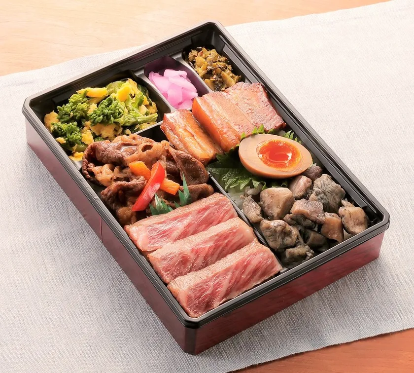 県産「黒毛和牛」のサーロインステーキ・焼肉、「黒豚」の角煮、「鶏」の炭火焼の3種の味わいを楽しめる豪華肉弁当。