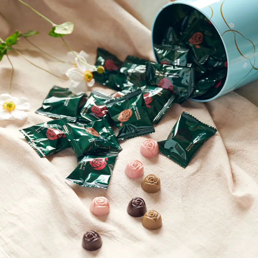 人気のパニエが新しいパッケージで登場しました。可愛らしい薔薇のチョコに濃厚なソースが入った商品です。厳選した味は、紅茶チョコに紅茶風味のソース、ラズベリーチョコにいちごのソース、ビターチョコにオレンジのソースの3種をご用意。1つずつ小分けになっているので大変食べやすく、見た目も可愛らしい商品です。