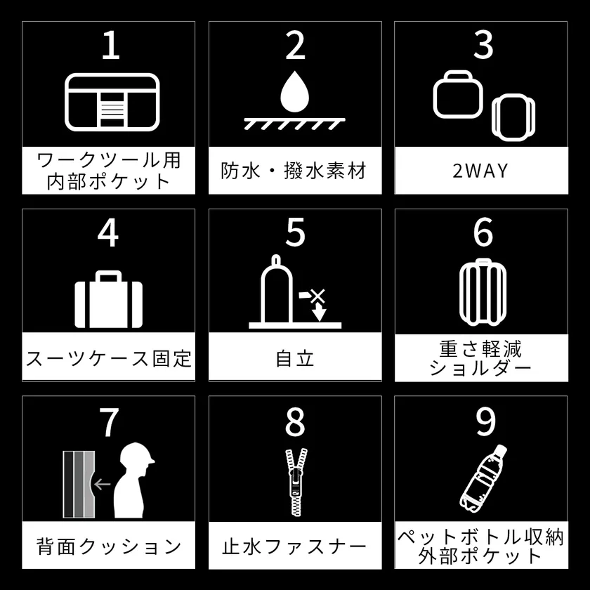 整理しやすい小分けのポケットになっており、書類や小物などをワークツールごとに収納できるようになっています。