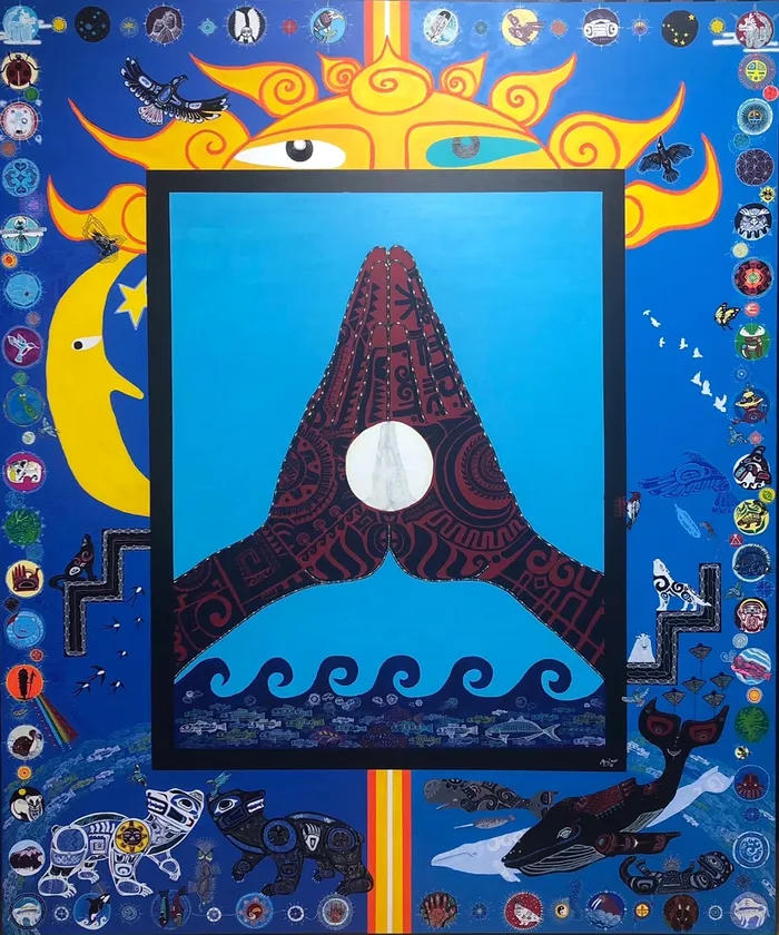 メイン作品はF130号(1,940×1,620ミリ)キャンパスに「私の頭の中の物語」を描きました。この星で出会った愛するいのち達を様々な点、線、紋様などを用い表現しています。この他、大小約80点の作品を展示、販売(一部非売品あり)いたします。