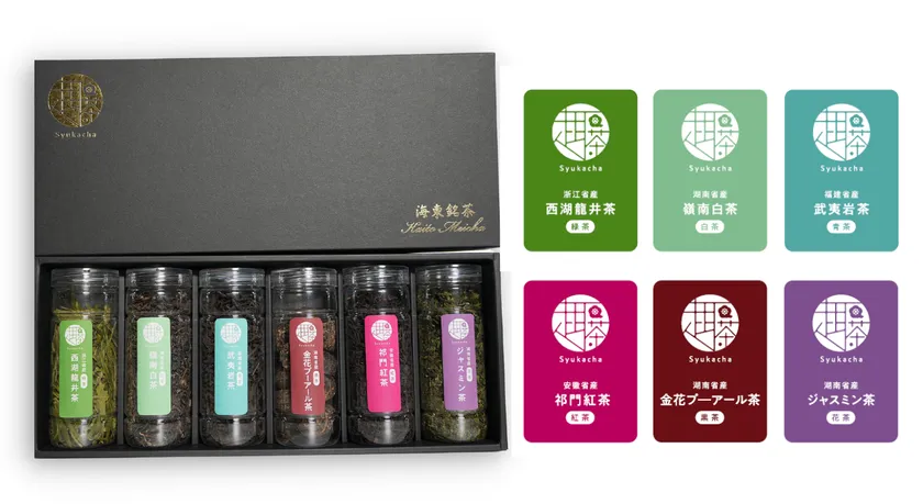 「趣華茶-syukacha-」には発酵度合いによる中国茶葉の6大茶分類のうち5つ(黄茶除く)をカバーしつつ、6大茶に匹敵する人気カテゴリである「花茶」を追加した計6種類を同梱。中国の国家資格である「評茶師」が厳選した味・香りともに格別な茶葉になります。